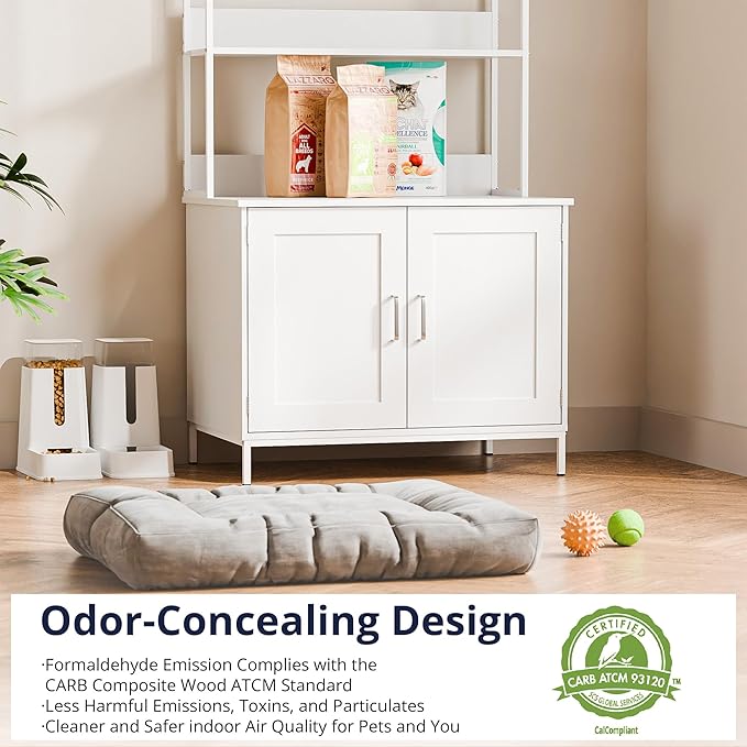 - Premium Quality & Durable: This cat litter box cabinet is made of CARB/EPA certified wood material, ensuring sturdy and durable construction. The formaldehyde emission rate is 0.09ppm or less, which is more environmentally friendly