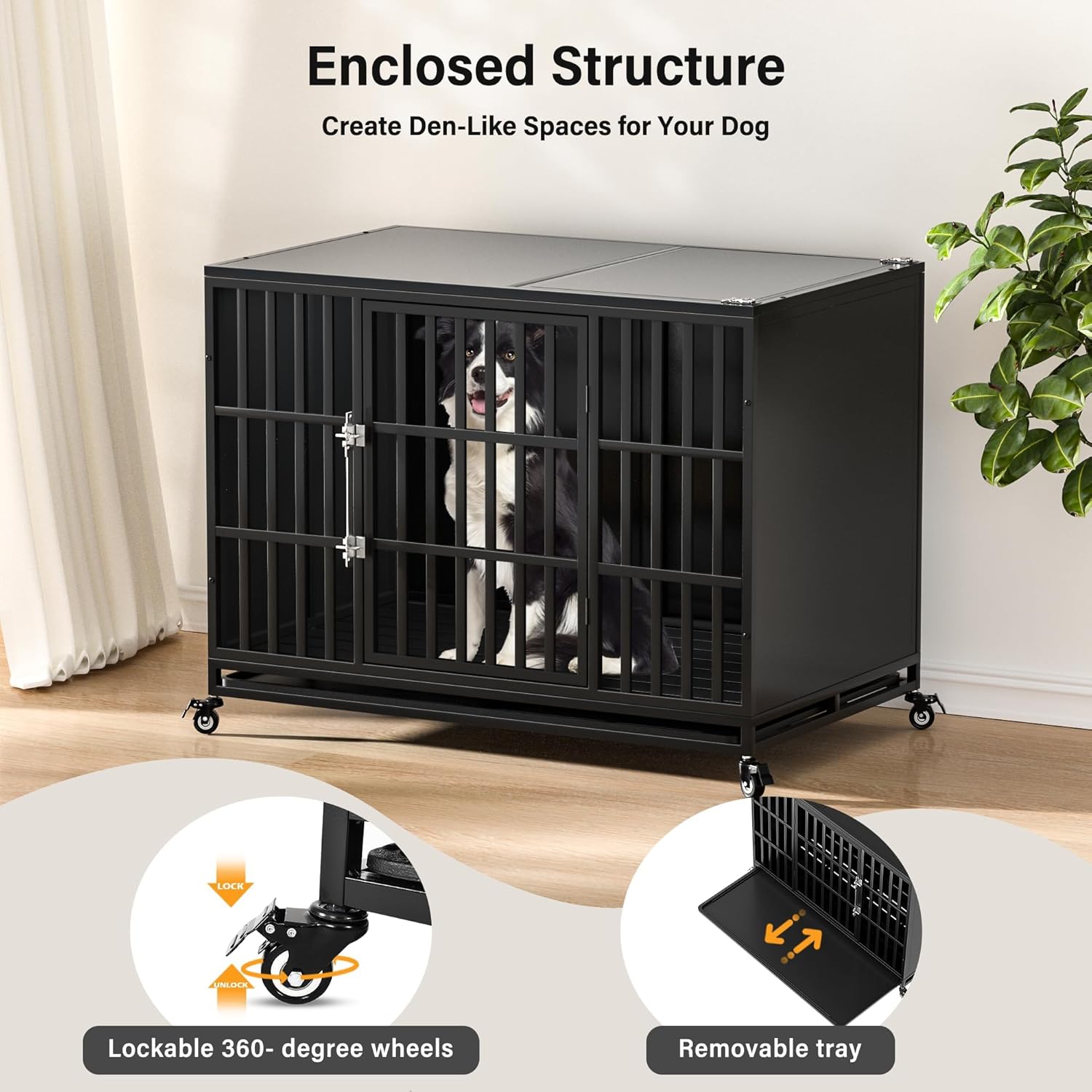 48 inch Heavy Duty Dog Crate with Self-Locking Latch, Indestructible Large Steel Kennel with Enclosed Design, Escape-Proof and Chew-Proof Pet Cage for High Anxiety Dogs