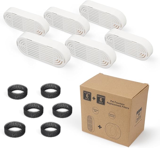 - 【Package】Package includes 6 cat water fountain filters replacement and 6 pre-filter sponges.