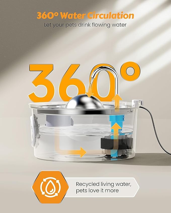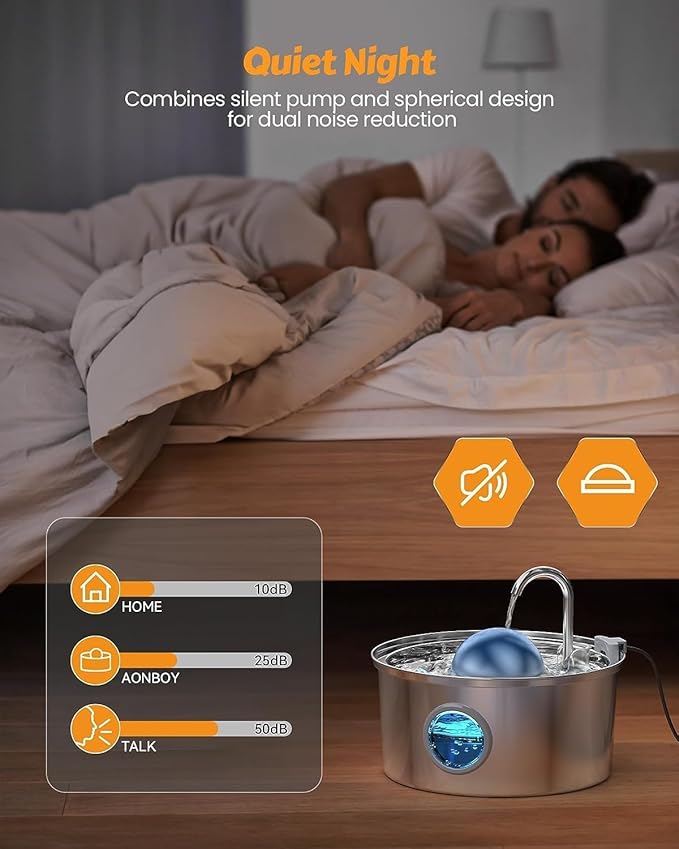 - 【Silent Pump, Silent Night】 The water fountain for cats inside combines a low-noise pump with a specially designed spherical structure to reduce noise during working. Provides a good night's sleep for you and your pet. If you encounter any problems, please contact us. Additional accessories are also available for purchase in our store