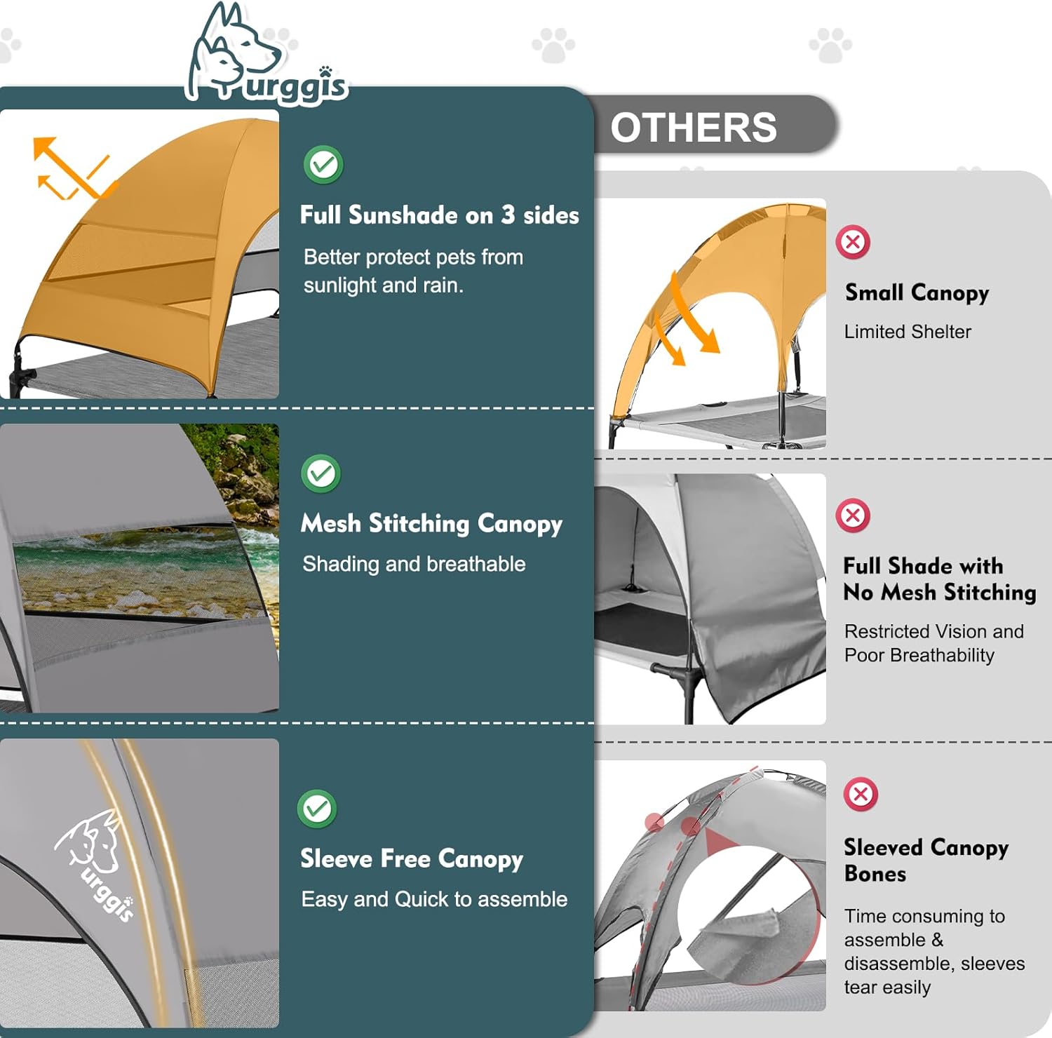 - Elevated Pet Cot With Anti-Scratch Breathable Bed Mat: Features a high density teslin breathable meshing bed mat, this bed is anti-scratch, breathable and odorless, no sticking hair and can be easily cleaned up by wiping or hosing off and keep clean. With this elevated dog bed with a large canopy, our furry kids will be better protected from ground heat and scorching sun in summer and keep dry in light rain (cover is recommended in heavy rain), let them have a cozy summer!