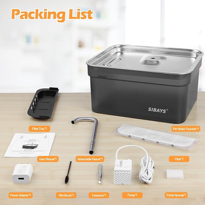 - [Food Grade Material & SUS304 Stainless Steel Water Bowl] SIBAYS cat water fountain is made of all food grade materials, safe, durable, not easy to deform. The extra thick SUS304 stainless steel water bowl is more durable and dishwasher-safe, easy to clean, and more healthier than plastic. The textured transparent water tank allows you to easily observe the water level.