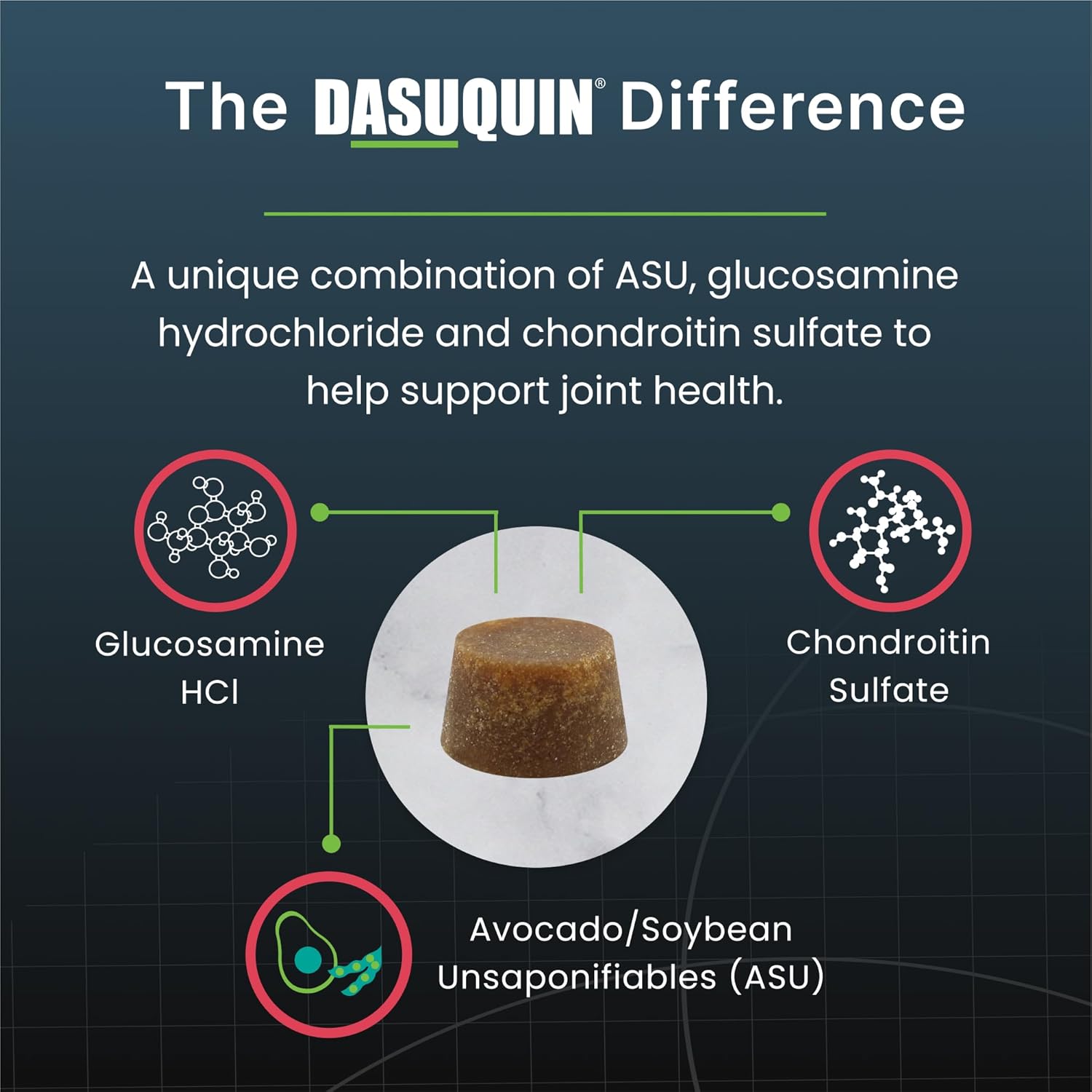 - Joint Health Support for Senior Dogs: Dasuquin, the #1 veterinarian recommended joint health supplement brand◆, contains avocado/soybean unsaponifiables (ASU), glucosamine hydrochloride, and sodium chondroitin sulfate that work better together to support joint health in dogs
