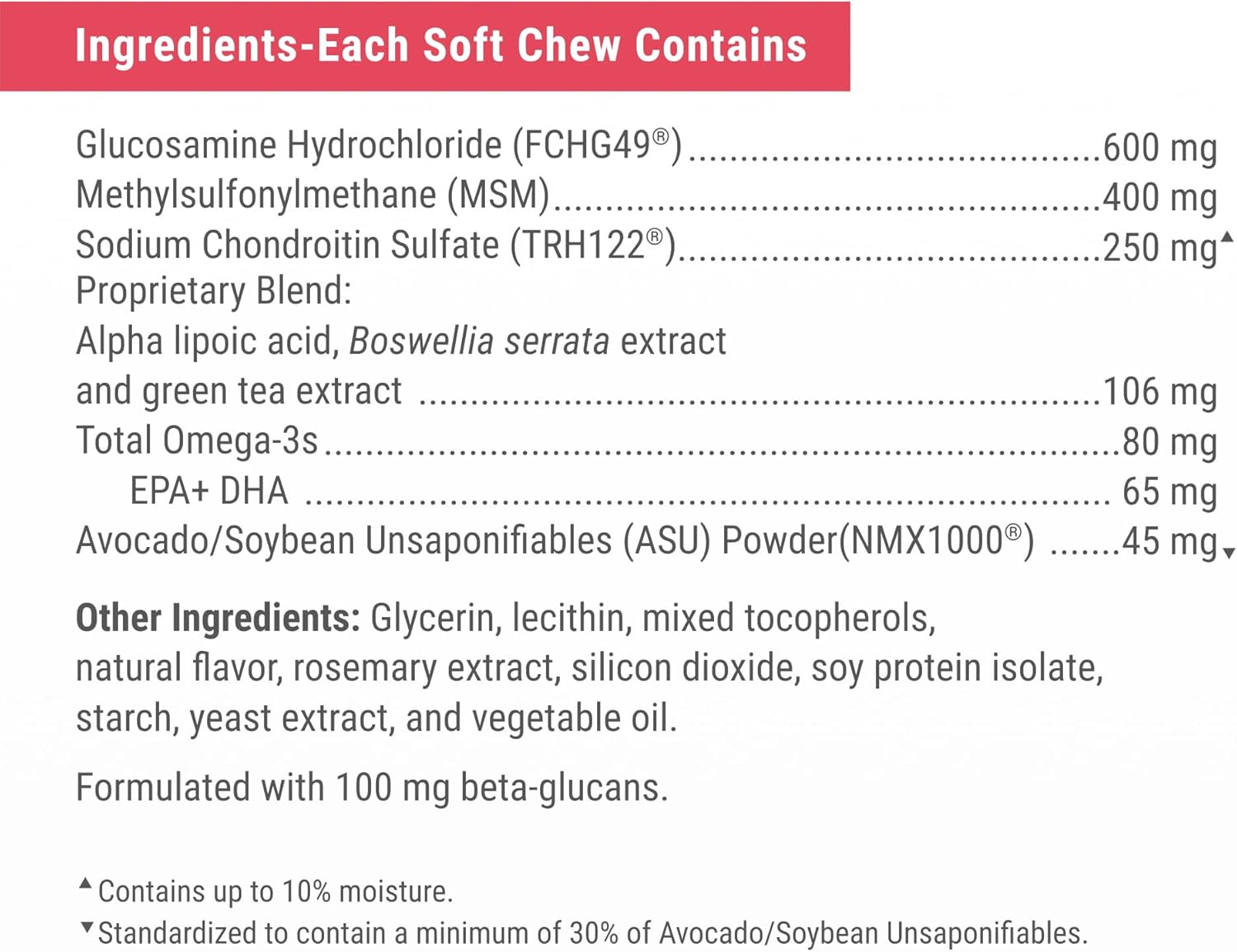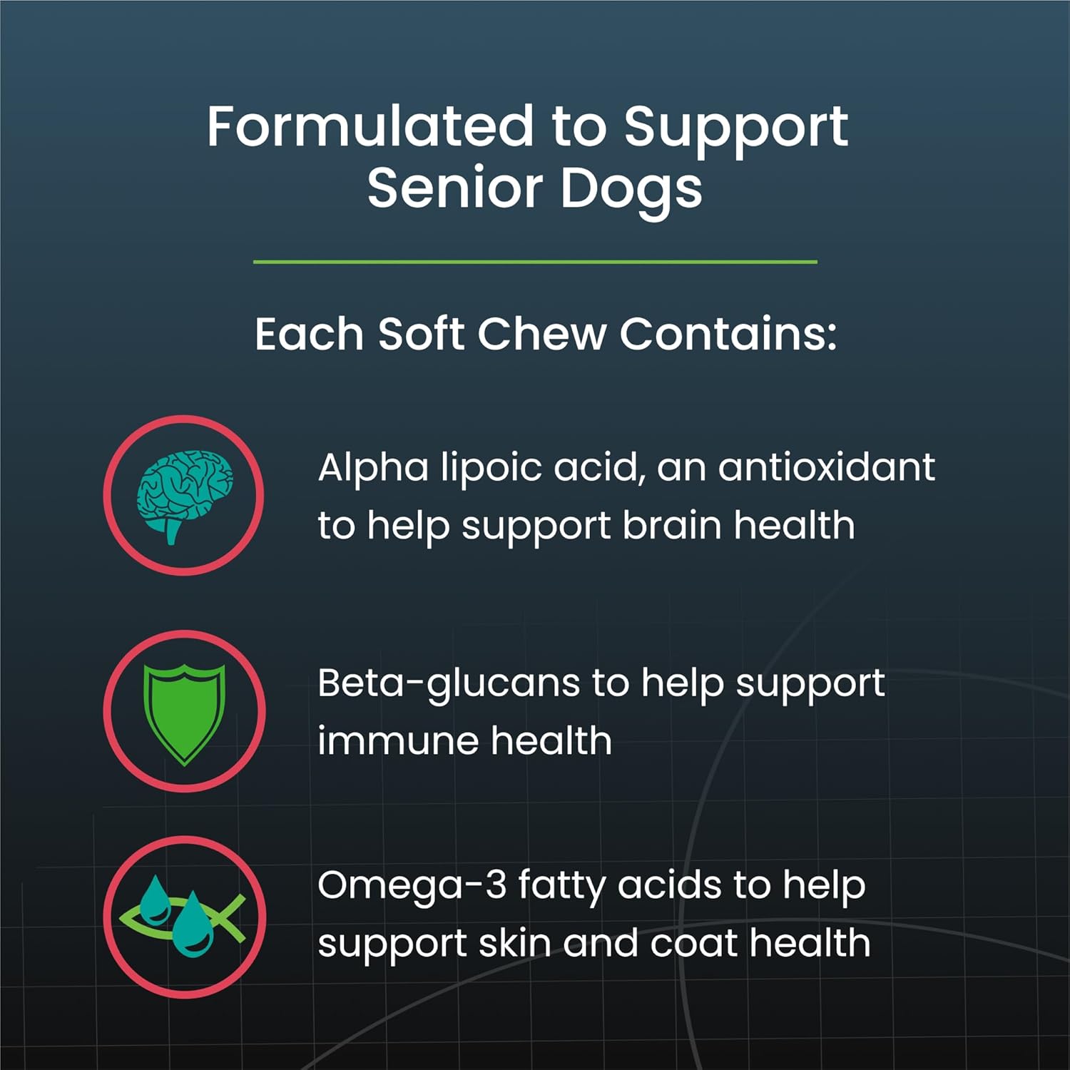 - Omega-3 Fatty Acids and Beta-Glucans: Each soft chew contains omega-3 fatty acids to help support skin and coat health and beta-glucans for immune support