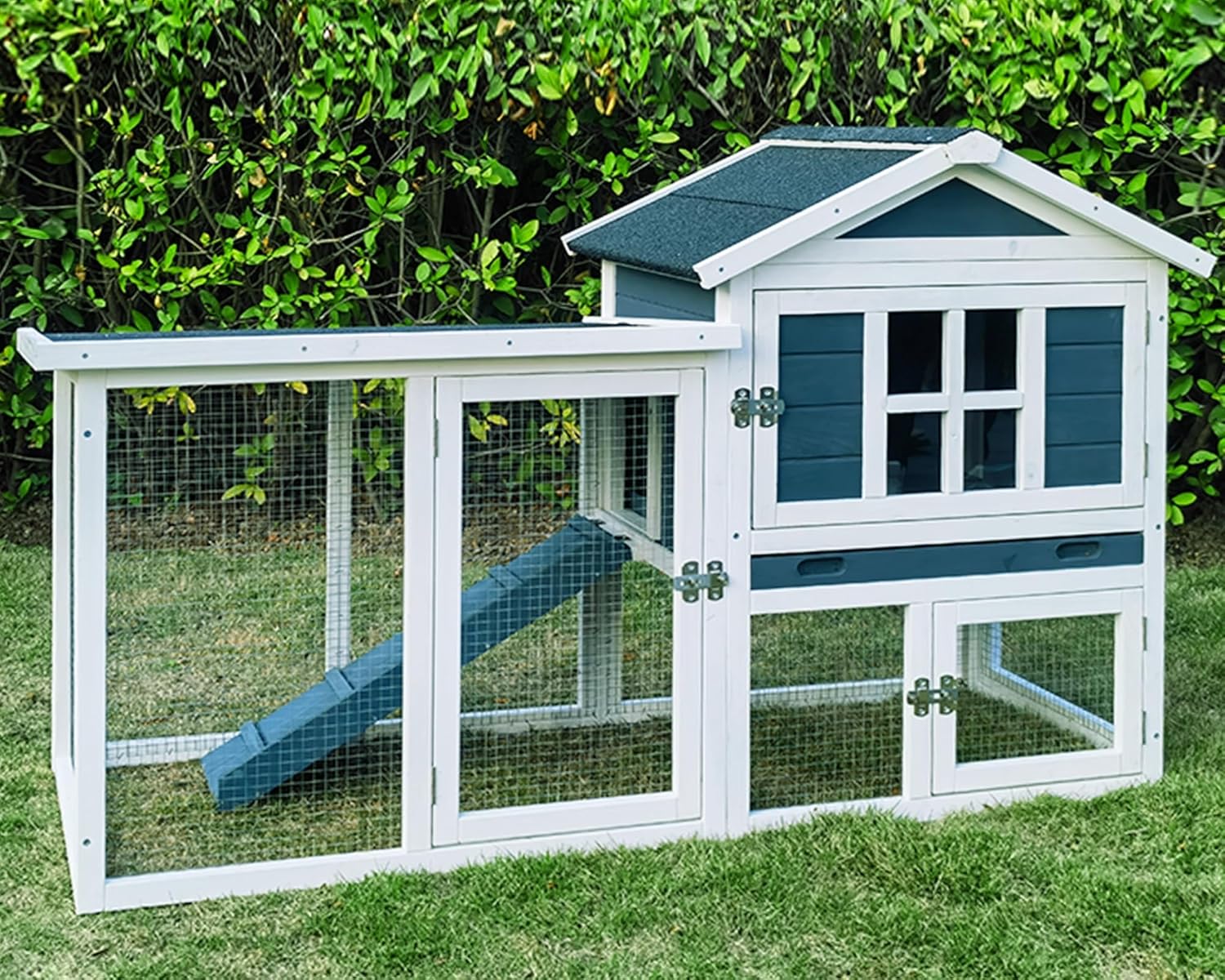 Large Outdoor Rabbit Hutch Weatherproof 2-Story Chicken Coop & Bunny Cage, Wooden Indoor/Outdoor Pet House with No-Leak Tray, Waterproof Roof & Pull-Out Tray (56.8" L x 34.7" H, Grey Blue&White)