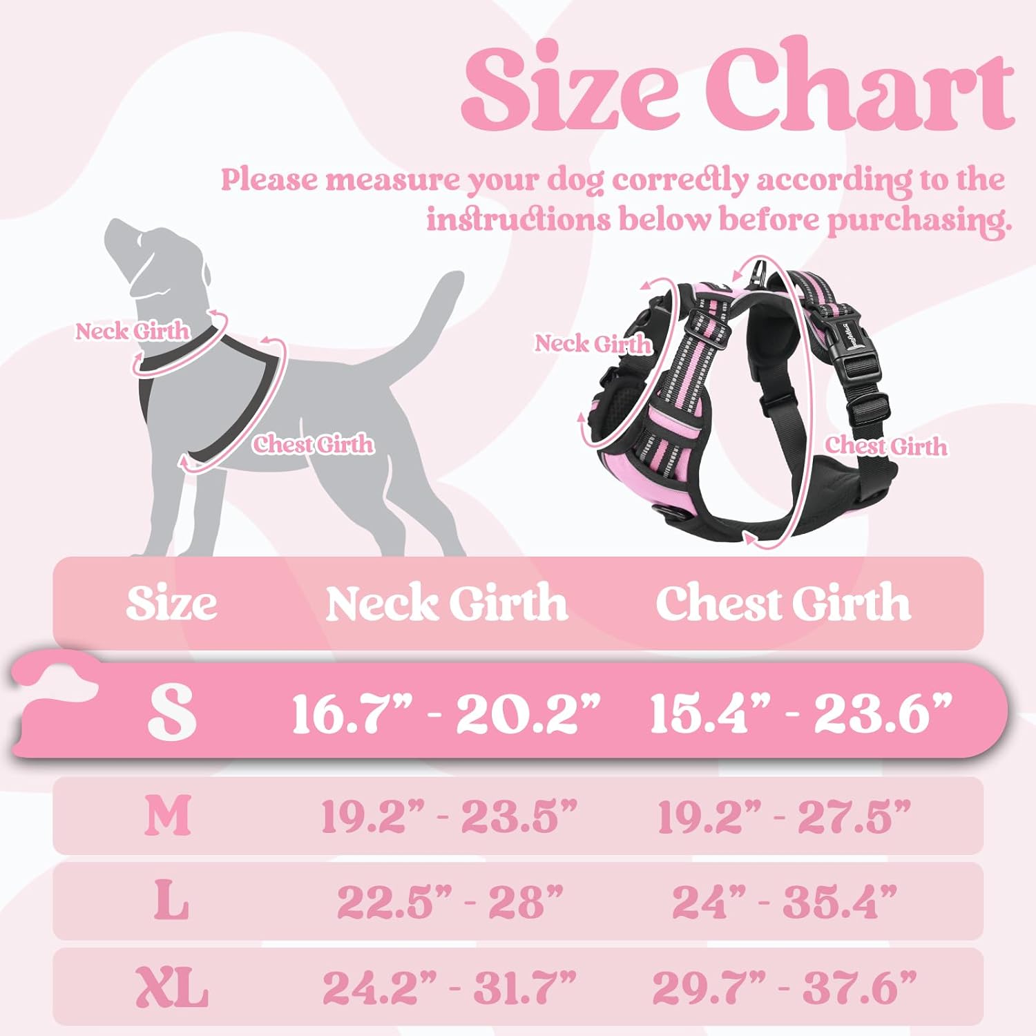 - Create a Snug Fit: 4 fully adjustable straps suit most breeds, fitting while allowing freedom of movement. The adjustable two chest straps and two neck straps were created specifically for dogs going through a fast growth period. Size information: 16.7"- 20.2" Neck Girth, 15.4"- 23.6" Chest Girth