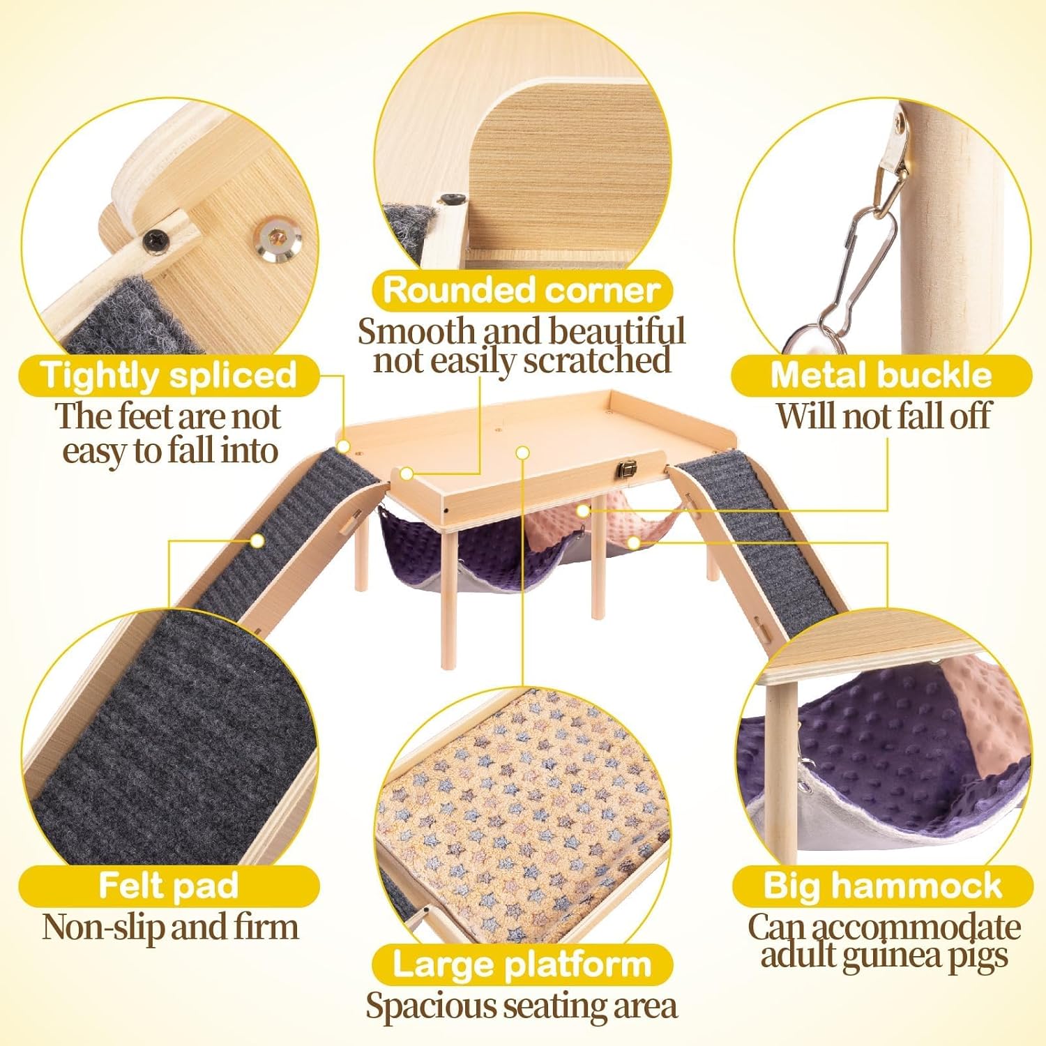 - 【LARGE SIZE】Platform:23.62x12.99 in, Hammock:21.65x11.81 in, Stairs: 13.78x6.30 in This guinea pig hammock and platform is designed to be large and suitable for guinea pigs of all ages. There is a guardrail above the platform to protect the guinea pigs. The 2 stairs are wide enough with felt pads for the guinea pigs to climb up and down easily. This design can help guinea pigs exercise and play well.