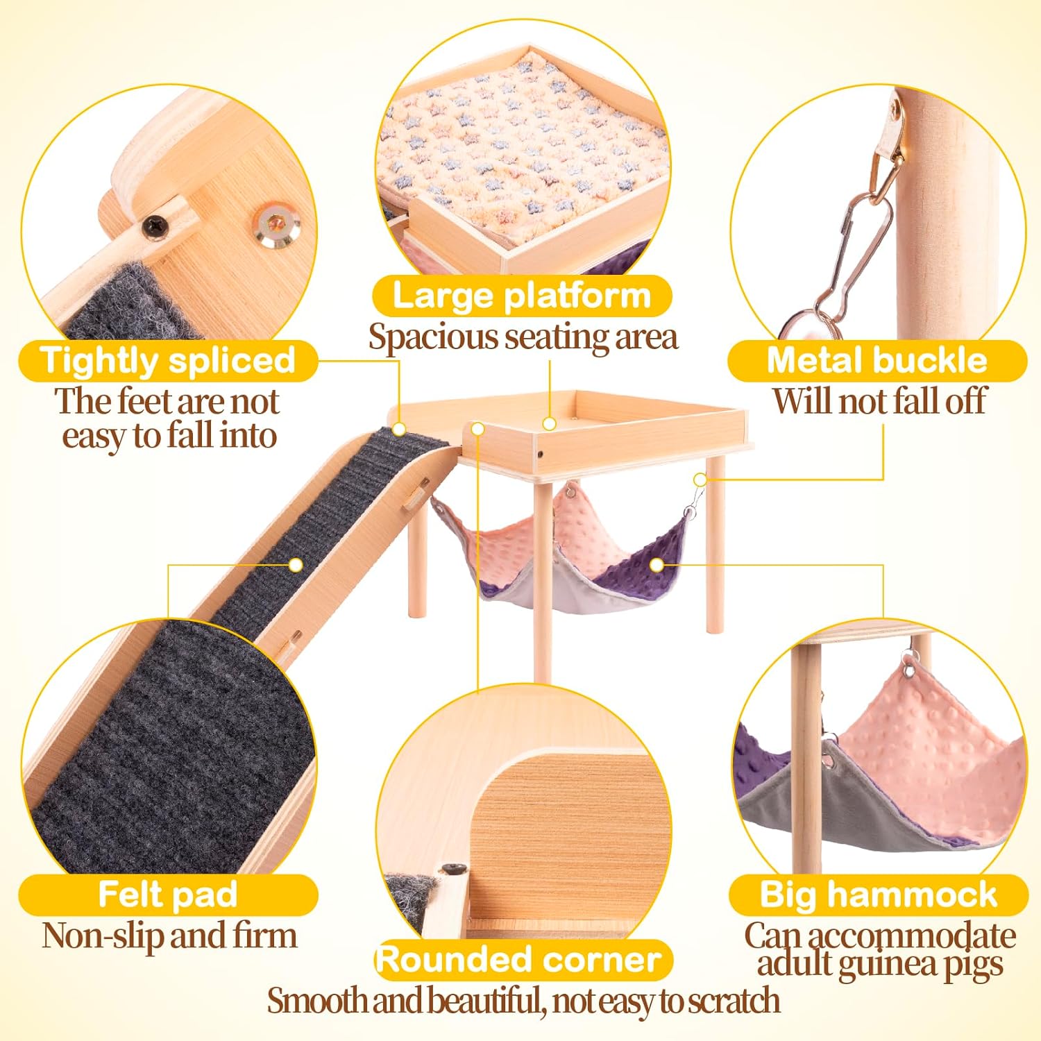 - 【LARGE SIZE】Platform:12.99x12.99 in, Hammock: 11.81x11.81 in, Stairs:13.78x6.30 in This guinea pig hammock and platform is designed to be large and suitable for guinea pigs of all ages. There are guardrails above the platform to protect the guinea pigs. The stairs are wide enough with felt pads on them so the guinea pigs can easily climb them. This design can help guinea pigs exercise and play well.