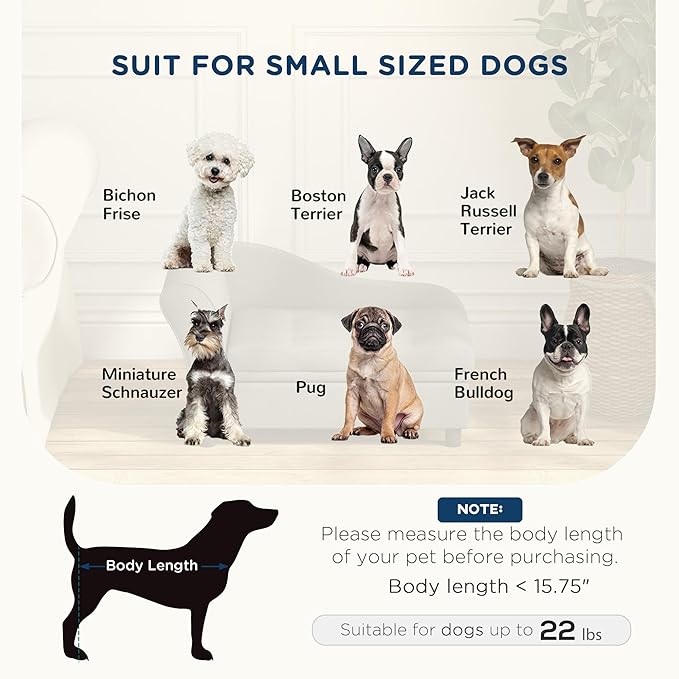 - Couch for Dogs Info: Overall Dimensions: 29.9" L x 17.7" W x 16.9" H. Storage Space: 25.25" W x 14.75" D x 3.75" H. Suitable for small dogs up to 22 lbs. and 15.75" in body length.