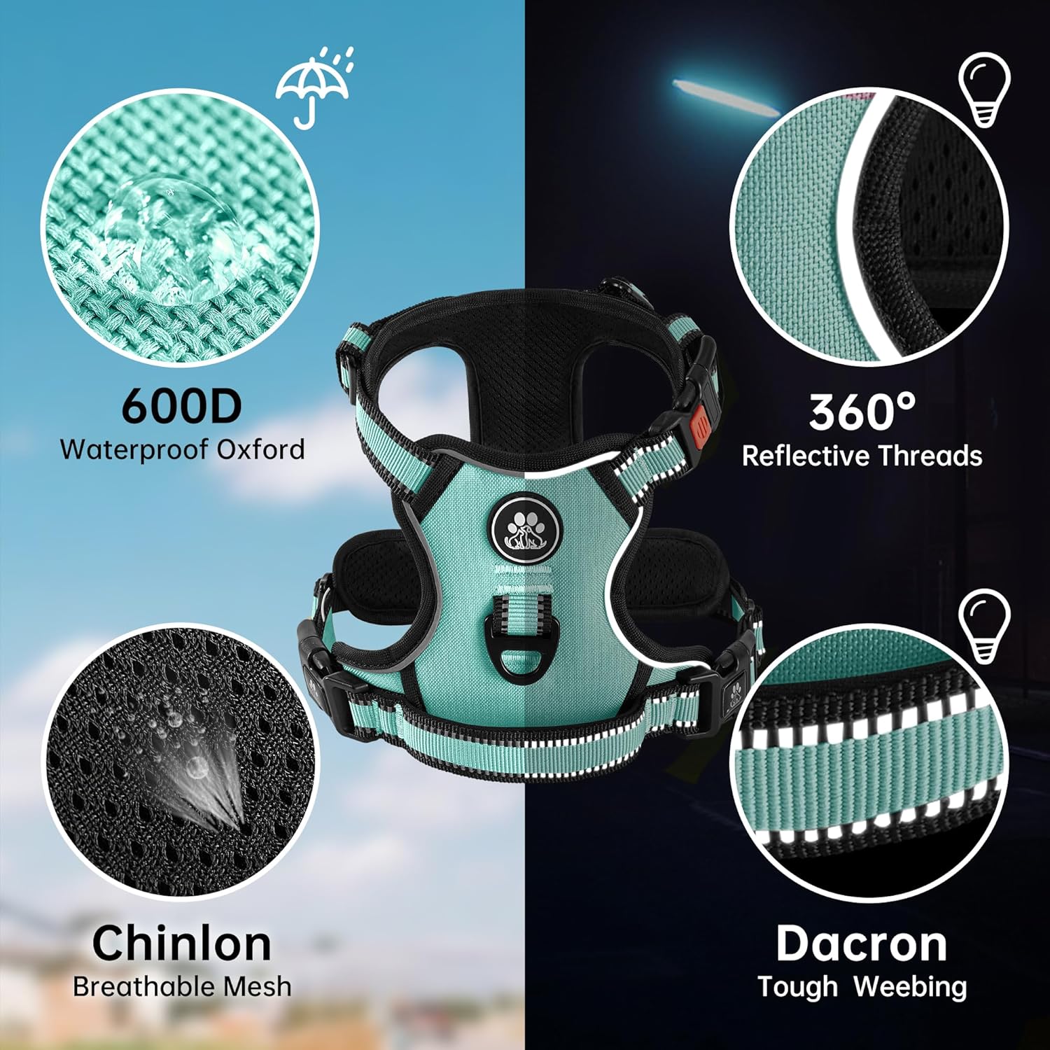 NESTROAD No Pull Dog Harness,Adjustable Oxford Dog Vest Harness with Leash,Reflective No-Choke Pet Harness with Easy Control Soft Handle for Medium Dogs(Medium,Turquoise)