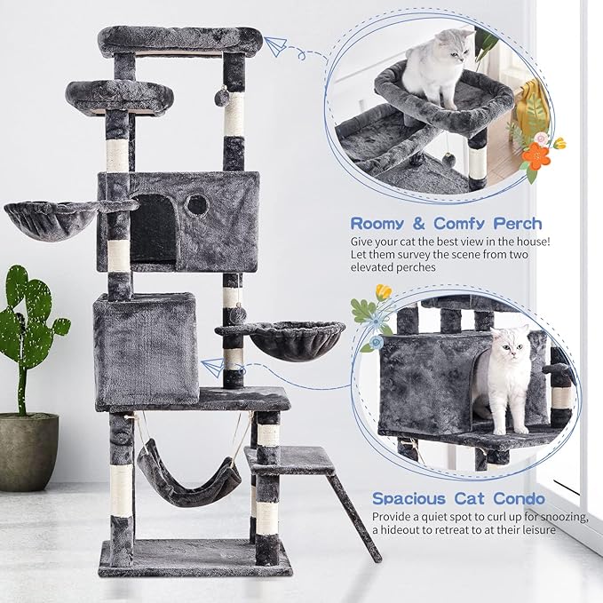 Cat Tree for Indoor Cats Large Adult, 66.9 Inches Multi-Level Tall Cat Tower with Sisal Scratching Posts, Large Plush Perches, Spacious Condos, Baskets, Hammock & Scraping Ladder (Dark Gray)