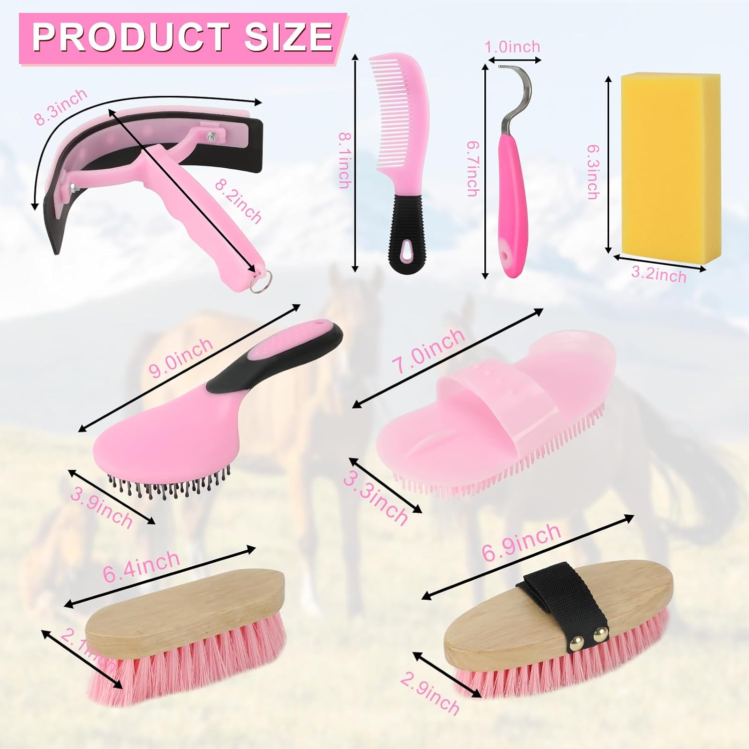 Horse Grooming Kits, 9 Pieces Pink, Includes Tote Bag, Bathing Supplies Sweat Scraper Bathing Sponge, Hoof Pick, Curry Comb for Horse Riders Beginners