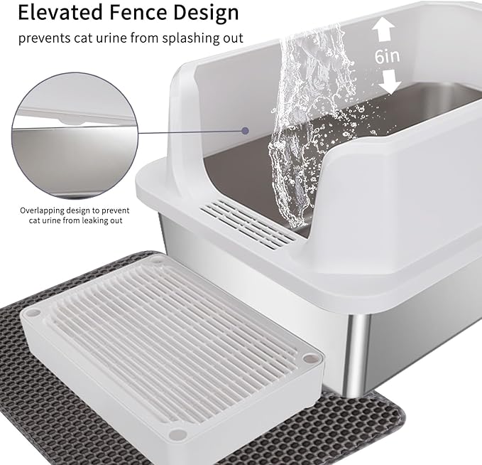 - 【Stainless Steel Litter Box】 The litter box is made of stainless steel, which is stronger and more durable than plastic litter boxes and will not rust, the litter will slide off the smooth surface without leaving scratches, making it suitable for long term use. Stainless steel litter boxes also don't have an odor, creating a safer and cleaner environment for your cat.