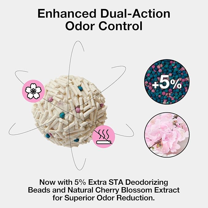 - 【Superior Odor Control】 This tofu litter is infused with natural cherry blossom plant extract, which can help mask unpleasant odors. Plus, extra added 5% deodorizing beads that effectively control odors, ensuring a fresh and odor-free space.