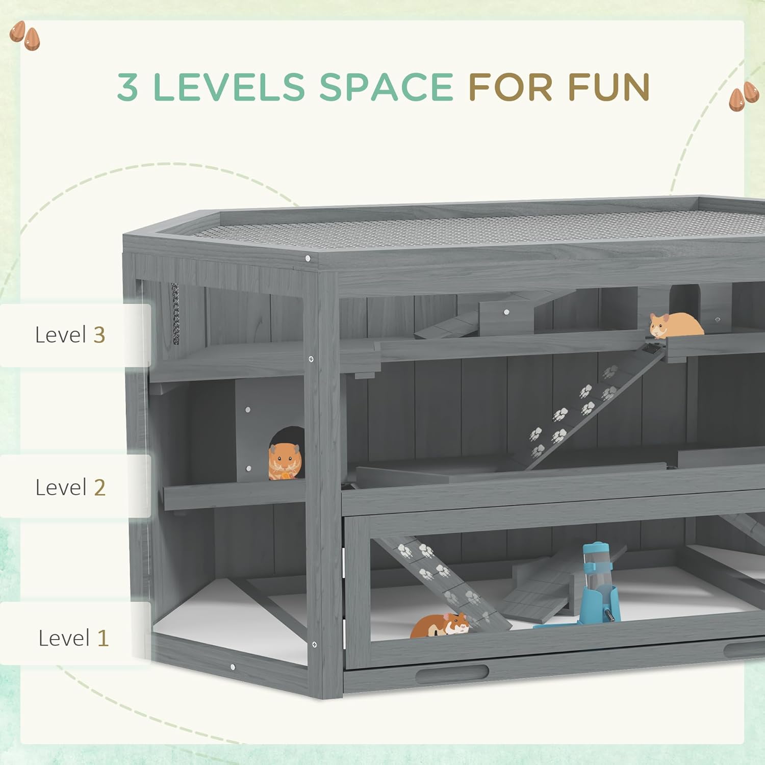 PawHut Wooden Large Hamster Cage Small Animal Exercise Play House 3 Tier with Tray, Seesaws, Water Bottle, Activity Center, Gray