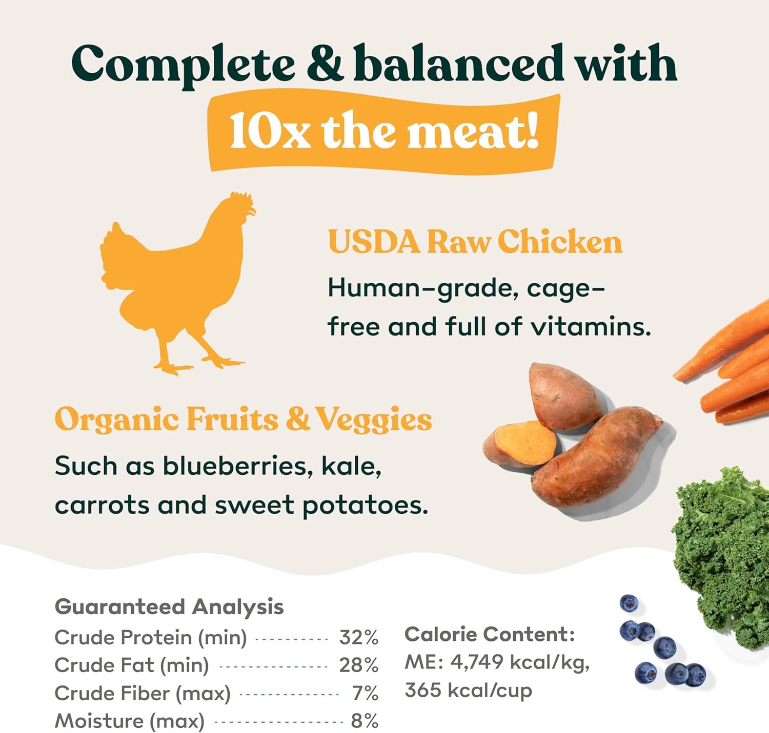 - HUMAN-GRADE: Made from just quality, cage-free, human0grade USDA-rated raw chicken, and balanced with fresh, organic fruits and veggies – that’s it! Our grain free dog food gives pups balanced, natural nutrition.
