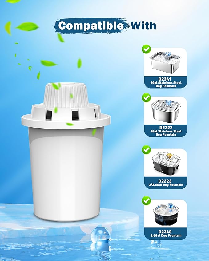 - Compatible With: Our 4-pack replacement filters for pet water fountains are specifically designed to fit the following models: D2341, D2223, D2322, and D2340. Please note that the package includes only 4 replacement filters; the pet water fountain must be purchased separately