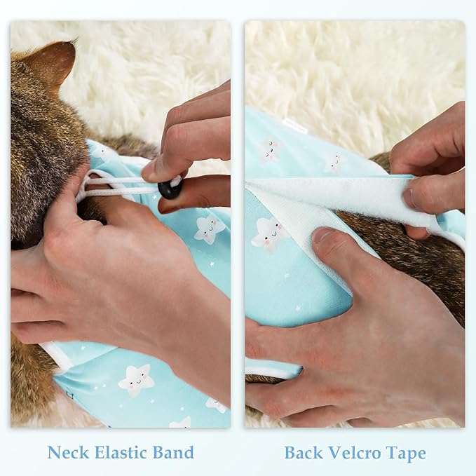 - 【Secure Fit and Easy to Put on】 Our cat surgery suit features adjustable neck elastic band and back velcro tape design, providing a secure and customized fit for your furry friend. Recovery suit for cats after spay can reduce the risk of escape or removal, and allow for easy adjustment to accommodate the cat's size and comfort.