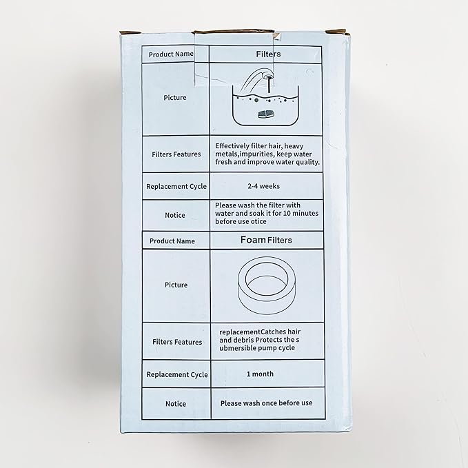 - 【Warm advice】Regularly changing the filter of the pet fountain can provide a better drinking experience for your pet, we recommend changing the filter every 2-4 weeks to protect the health of the pet. Soak the filter for 5 minutes before use.