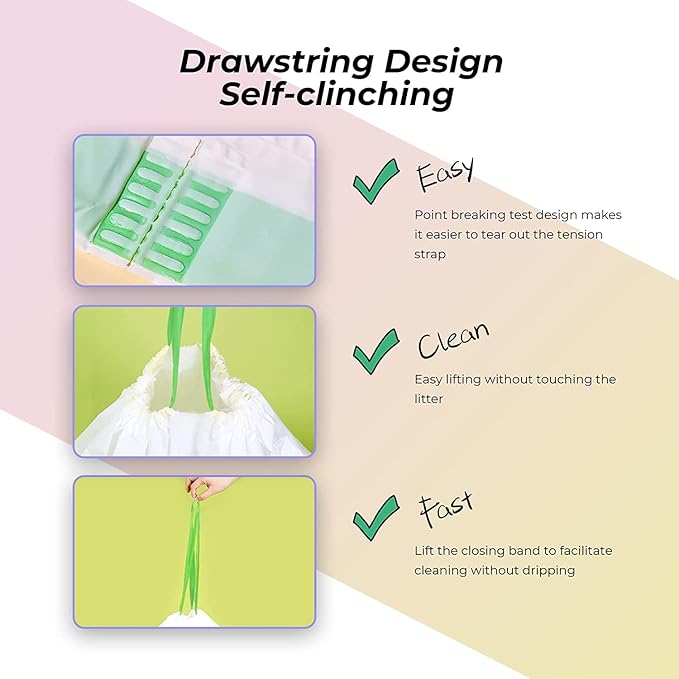 - Drawstring Design, Easy to Use: Self-clinching and leakproof cat trash bags make cleaning litter a cinch. No More Messes, No More Scrubbing, No Odor. When it’s time to change the litter, just lift litter bags ties, close and throw away. Cat owners can finish clean kitty litter box within 30S