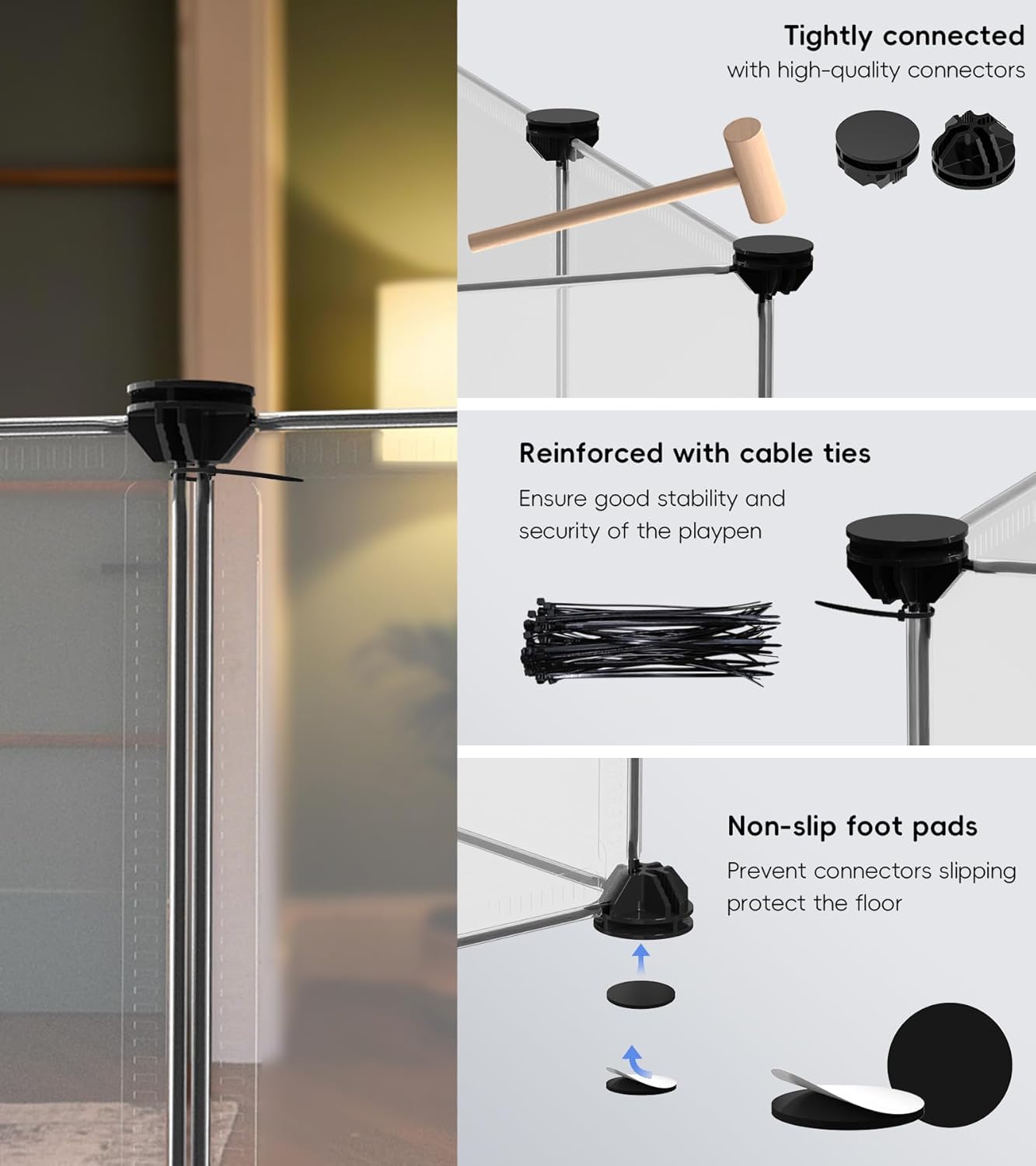 - 𝐒𝐭𝐚𝐛𝐢𝐥𝐢𝐭𝐲 𝐚𝐧𝐝 𝐏𝐫𝐨𝐭𝐞𝐜𝐭𝐢𝐨𝐧: Equipped with 84 nylon straps to securely fasten the small pet fence, and 24 anti-slip mats to prevent the fence from sliding on the floor, providing a stable play area for your pets.