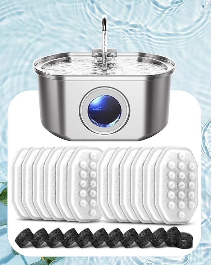 - Package: The package contains 8 Pack Replacement Filters & 8 Pack Pre-Filter Sponges. This pet fountain filter replacement set is used for stainless steel 3.2L/108oz Pet Cat Water Fountain.