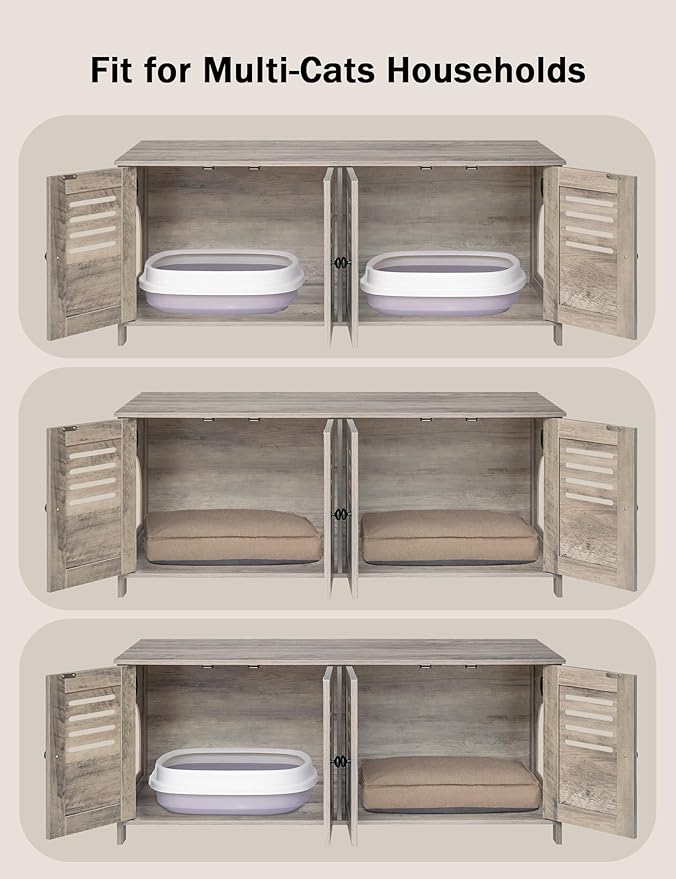 - 【Dual-Room for 2 Cats】Double rooms hidden litter box furniture features 2 large openings on both sides, allowing your pet to enter and exit freely. Spacious interior space can easily accommodate 2 cats and fits most of common litter box. The best choice for multi-cat family