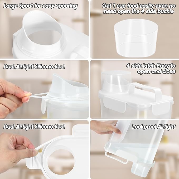 5-7Lbs Dog Cat Food Storage Container with Upgraded Large Nozzle BPA-free, 4 Snap Seals Plastic Pet Food Storage Containers with Handles (1, White, 5L)