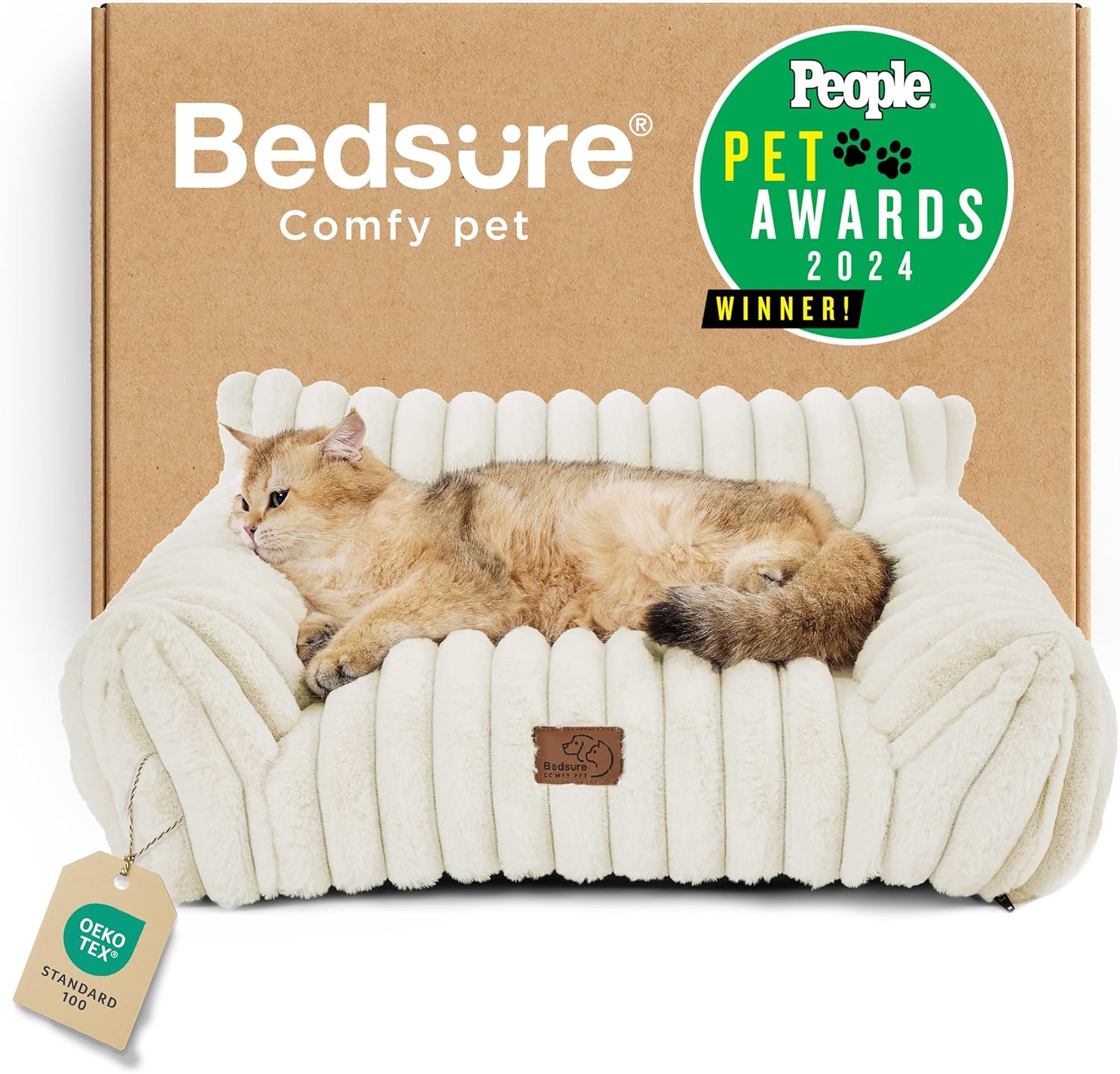 Bedsure Cute Couch for Pets - Fluffy Pet Sofa with Premium Soft Corduroy Fleece, Fuzzy Cat Beds for Indoor Cat with Removable Washable Cover, Supportive Pet Chair, 24inch, Cream