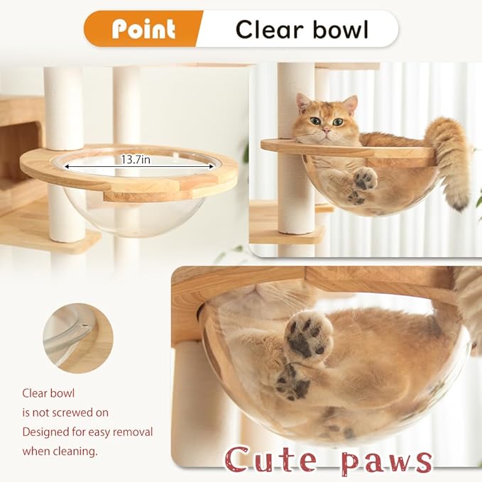 - Private Cat House & Acrylic Bubble Lounge-Includes a cozy wooden cubby with a cute cat-head opening for privacy and an acrylic bubble perch to satisfy your cat’s curiosity and love for elevated views.