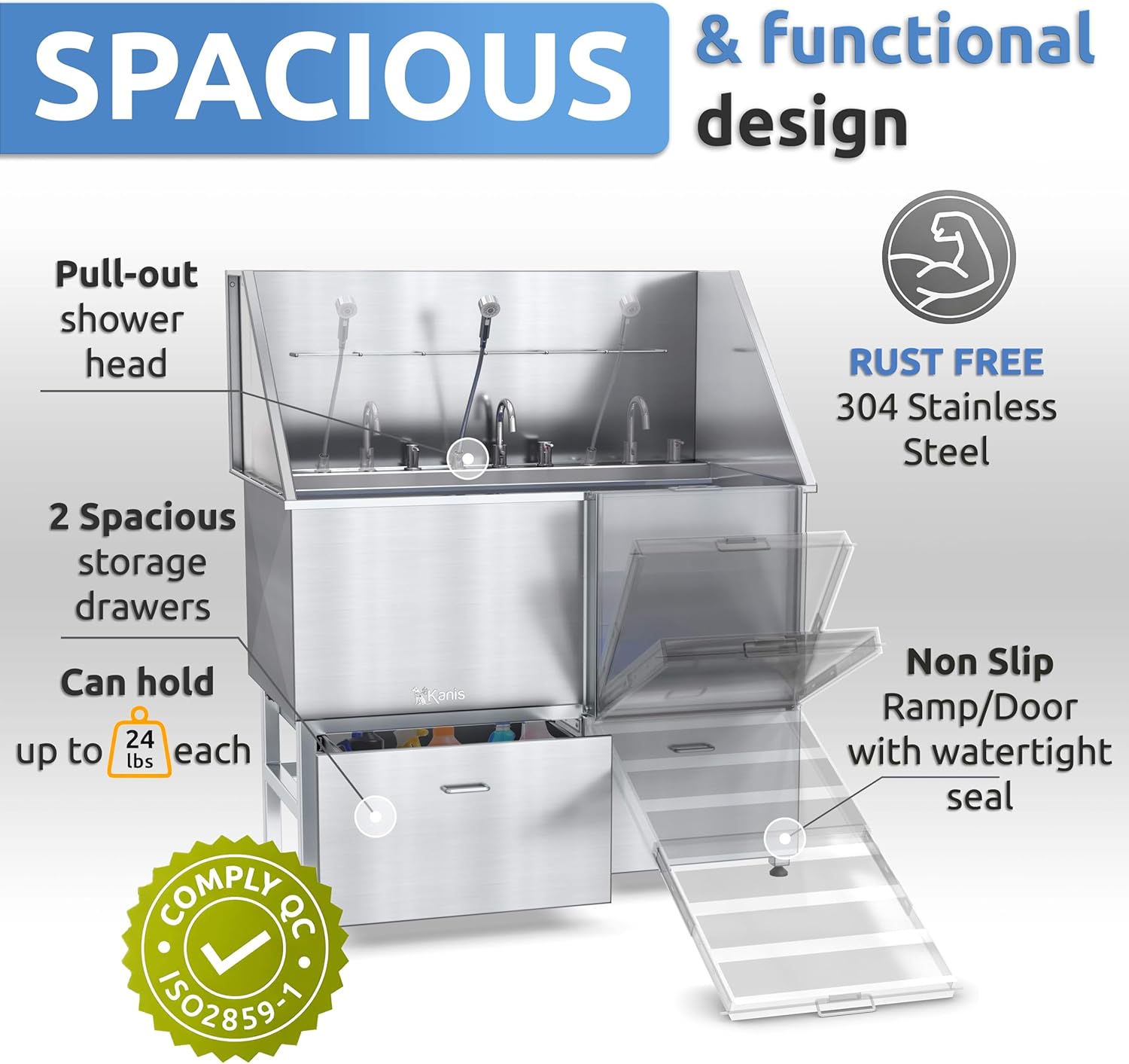 KANIS Professional Dog Washing Station - 304 Stainless Steel Pet Wash Sink & Grooming Bath Tub for Home with Ramp, Shower, Floor Grate, Storage Drawers, and Faucet for Large, Medium & Small Pets