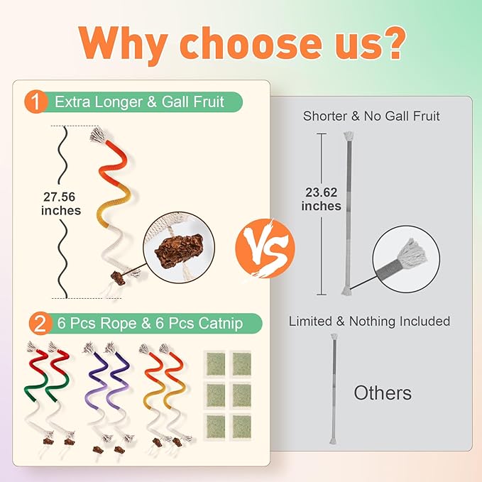 - 【Regulate Mood Kitty Toys】Watch your cat's curiosity come alive with our interactive rope cat toy, complete with a dangling gall fruit at the end. Stimulating your cat's natural hunting instincts, this toy provides endless amusement and promotes overall well-being.