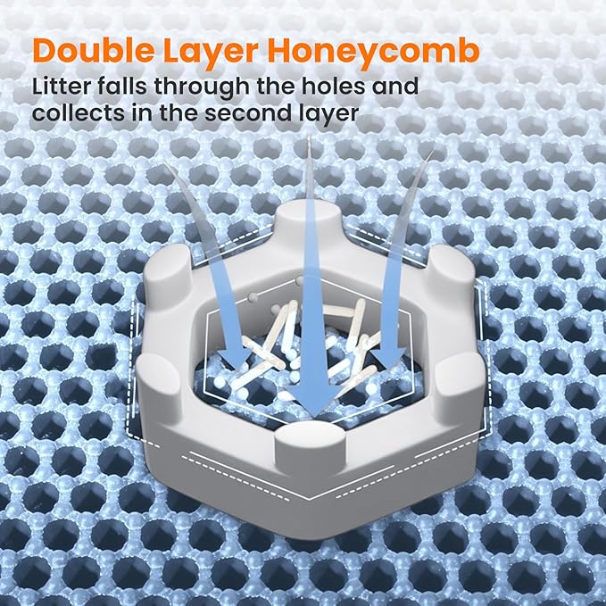 - Double Layer Honeycomb Structure: The holes in the top layer trap all types of litter and let it fall through to the waterproof bottom layer for effortless cleanup. Just lift litter catcher mat, pour the collected litter back, and reuse — no mess, no hassle. This smart design helps reduce litter waste and makes daily cleaning faster and easier!