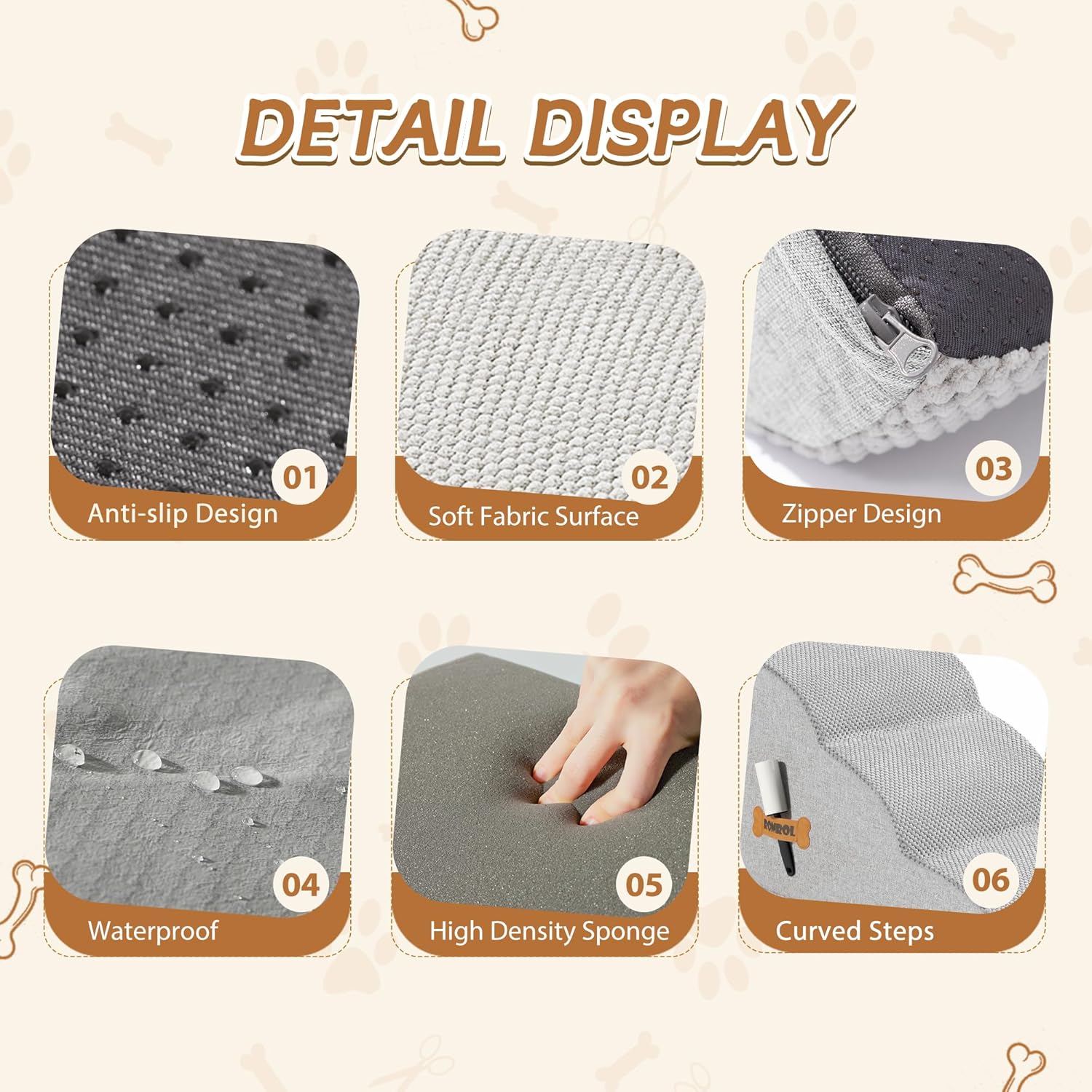 - SOFT 4 STEP RAMP SYSTEM: 4-step ramp design (15.7"x23.6"x15.7") reduces impact on paws by 58%. With breathable elastic wraps that mold to your foam's shape while maintaining scratch resistance. Machine-washable cover included. But, please note that the inner foam is not washable