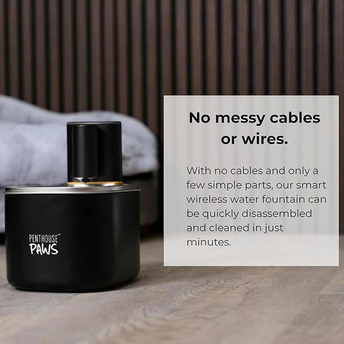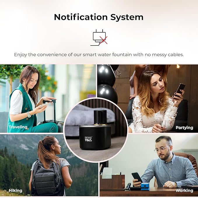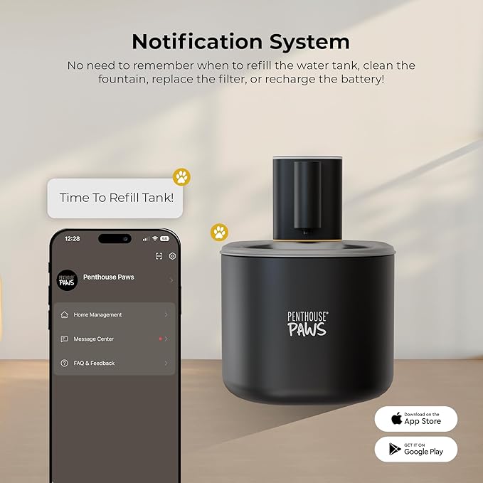 - Smart App Control & Alerts: Connect via WiFi to the Penthouse Paws App for real-time reminders to refill water, clean the tank, replace filters, or recharge the batter, ensuring your pet never runs dry.
