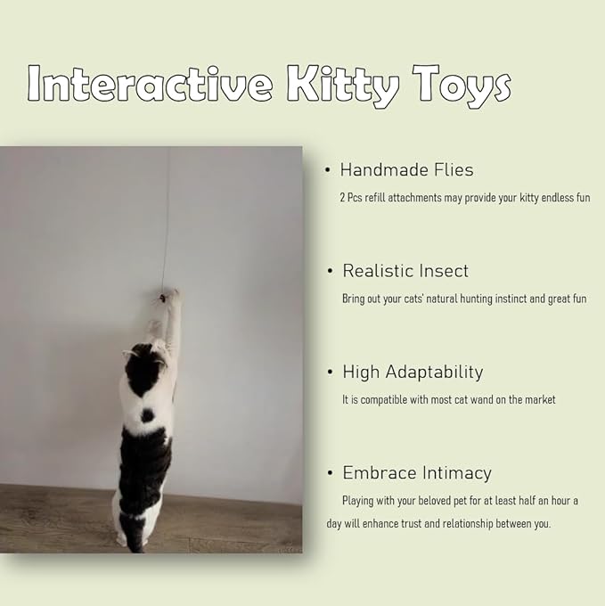 - REALISTIC Looking - The cat wand attachments are so REALISTIC looking like natural flies, which may bring out your cats’ natural hunting instinct and bring great fun. It is important for cats who need exercise to control their weight