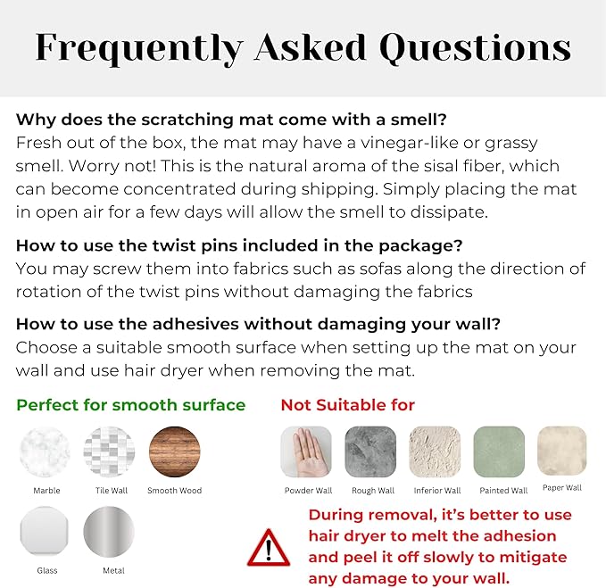 - Shedding-resistant Material for Less Mess, More Comfort: Reduce shedding and mess with our natural sisal material. Provide your cat with a safe and comfortable scratching surface that doesn't create a mess. Keep your home looking and feeling fresh with our shedding-resistant cat scratcher mat.