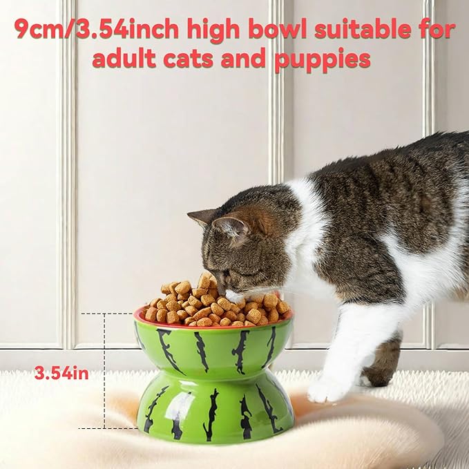 Hamiledyi Ceramic Raised Cat Bowl 5In Elevated Wide Cat Bowl for Food and Water Anti Vomiting Tilted Pet Feeder Dish for Indoor Cats and Small Dogs(Watermelon)