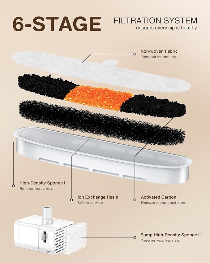 - 6-Stage Filtration: Non-woven fabric, double activated carbon, ion exchange resin, and double high-density sponge work together to filter out fur and impurities, eliminate odors, soften water quality, and purify heavy metals