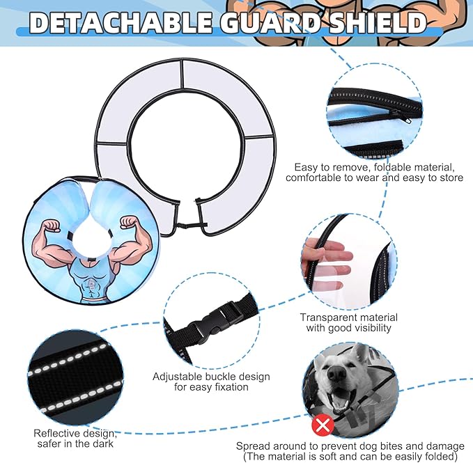 - WIDER ANTI-LICKING AREA: Compared to traditional inflatable collars, this type of inflatable collar has a detachable external plastic transparent protective cover around it, which has a larger anti licking range. Extending outward has replaced extending upwards, providing better visibility and preventing dogs from biting, making it less likely to be bitten. Our detachable baffle is easy to use and can be quickly connected or removed as needed, designed to make your pet's life easier.