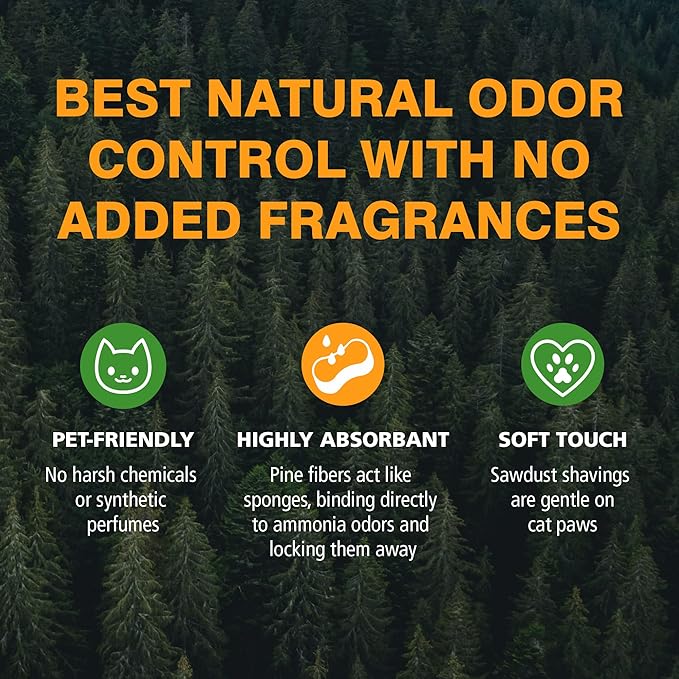 - HIGHLY ABSORBENT PINE LOCKS AWAY ODORS. The pine shavings in this lightweight non-clumping cat litter directly bind to odors like thousands of tiny sponges to soak up liquid and lock away ammonia odors to keep the litter box fresh and dry.