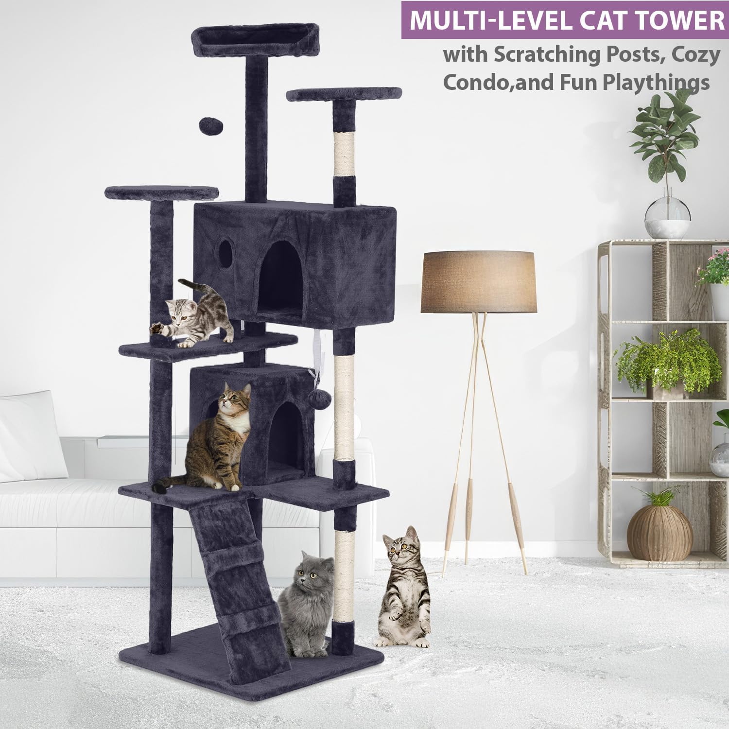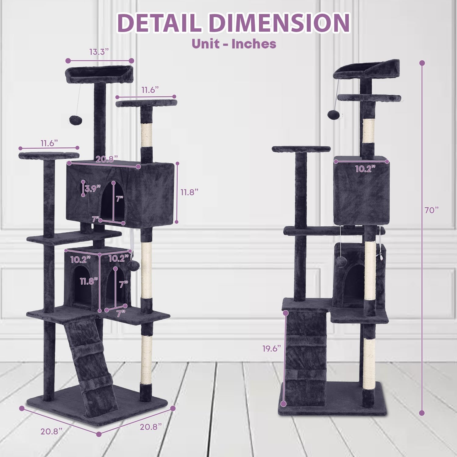 70 Inches Cat Tower for Indoor Cats, Multi-Level Cat Condos with Scratching Posts, Hanging Toys, Ashy