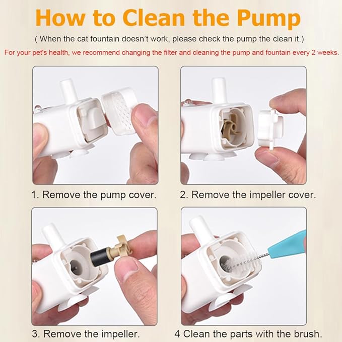 - 【Easy to Disassemble & Clean】The cat drinking fountains can be assembled and disassembled in just a few minutes, making it easy to clean and replace. For your pet's health, we recommend changing the filter and cleaning the pump and fountain every 2 weeks