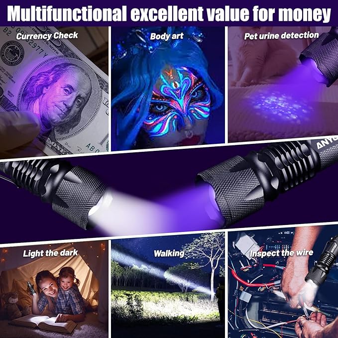 2-in-1 Black Light & White LED Flashlight, 395 nM UV Flashlight with Clip, 500Lm White LED Zoomable Tactical Flashlight, 4 Modes, IP55, UV Black Light for Pet Urine Detection, Resin Curing & Scorpions