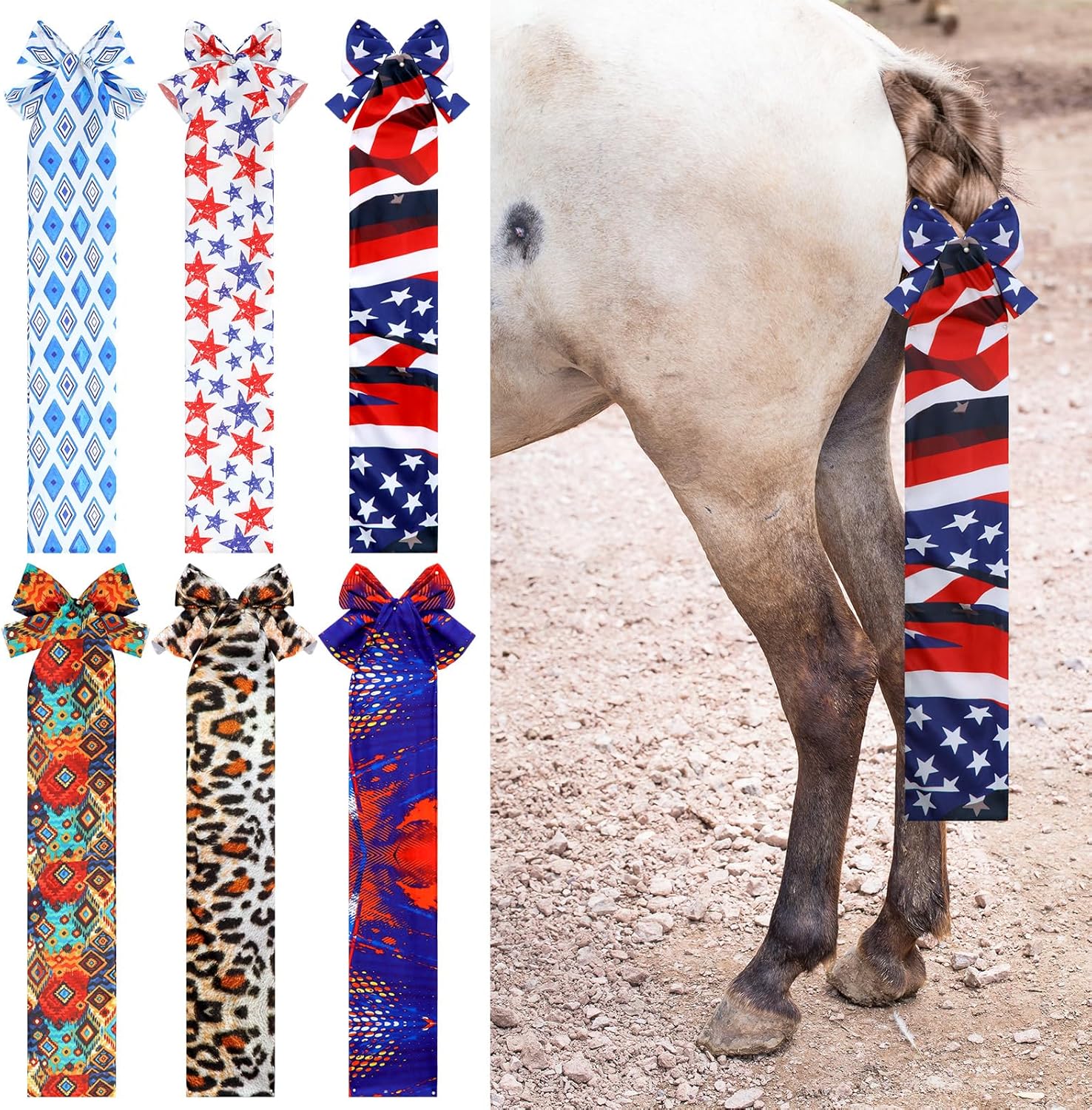 - Vibrant and Colorful Designs: our tail wraps for horses come in an array of colorful designs, giving horses a stylish appearance; Each of the 6 bags boasts a distinct design, diamonds, leopard print, stars, American flag, reflecting a vibrant and energetic vibe; The pictures genuinely express the bags' colors, adding a splash of color to any horse's tail