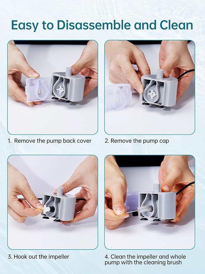 - Easy to Disassemble and Clean: The water fountain stainless steel replacement pump cap, cover, and inner components are all easily removable for quick cleaning. Regularly clean your pet fountain pump every 2-4 weeks to prolong its lifespan and ensure your pet enjoys fresh water