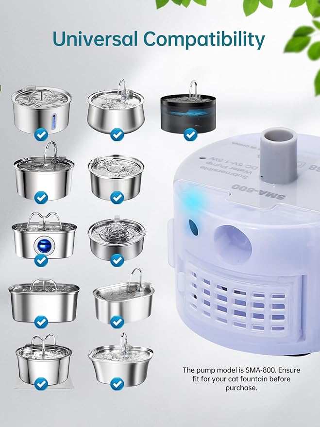 - Universal Compatibility: The cat water fountain pump is designed to fit a variety of pet fountains using the SMA-800 pump,,including the 108oz/3.2L, 67oz/2L, 84oz/2.5L, 134oz/4L stainless steel cat water fountain. Before making a purchase, please ensure the water pump is the original model to fit your pet fountain