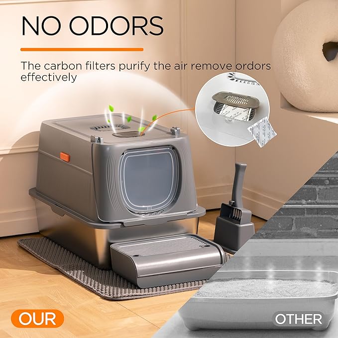 - Non-Odor--Enclosed cat litter boxes had upgraded structure, feature carbon filters to absorb odor effectively, ensuring a fresh and comfortable space