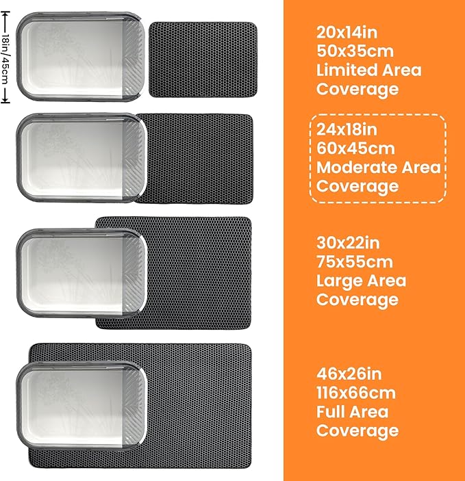 - Double-Layer Honeycomb Structure: The top layer features holes that capture all kinds of litter, allowing it to fall through to the waterproof bottom layer for easy cleanup. Simply pick up the kitty litter mat, pour the trapped litter back into the box, and reuse it—mess-free and effortless. This clever design minimizes litter waste and streamlines your daily cleaning routine.
