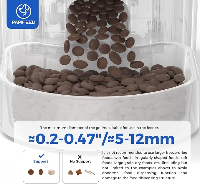 - 【Smart Feeding Technology】PAPIFEED automatic cat feeder can connect to 2.4GHz WiFi(not support 5GHz WiFi). you can easily set or change a customized feeding schedule remotely with the "Smart Life" mobile app. You can set up a feeding schedule of up to 10 meals per day, with 1-12 portions(about 1/8 cup per portion) per meal.